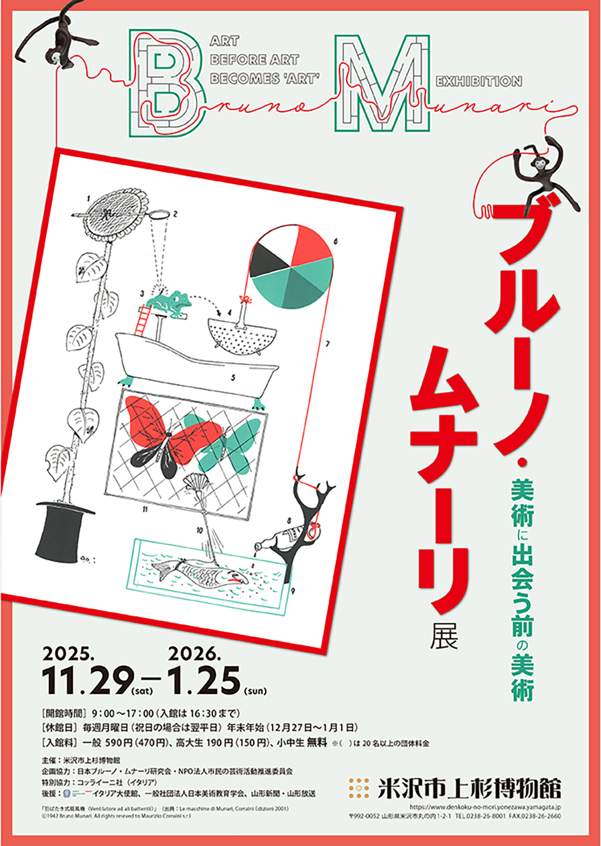 敷居が高い、よくわからないと思われがちな「美術」。ブルーノ・ムナーリ(1907-1998)は、そんな「美術」の垣根を取り払い、日常の中にある形や、色、デザインの面白さや美しさに気づかせてくれるイタリアのアーティストです。ムナーリは、プロダクトデザイン、グラフィックデザイン、絵本の制作、子どものための造形教育など多岐わたる分野で活躍し、独創的でユーモアあふれる作品を世に送り出しました。アートは、鑑賞の対象であるだけでなく、メッセージを伝える手段や、想像力を刺激するきっかけでもあり、何よりも楽しめるものであるべきだと考えたムナーリは、人が豊かな生活を送るためのアートを様々なかたちで発表しました。 本展は、約300点の作品や資料を通じ、視覚的な要素による伝達力や日常の中にあるアートの種をかたちにする楽しさを実感してもらう展覧会です。言葉はいらない、もう一つのアートの力に気づくことができます。 |
