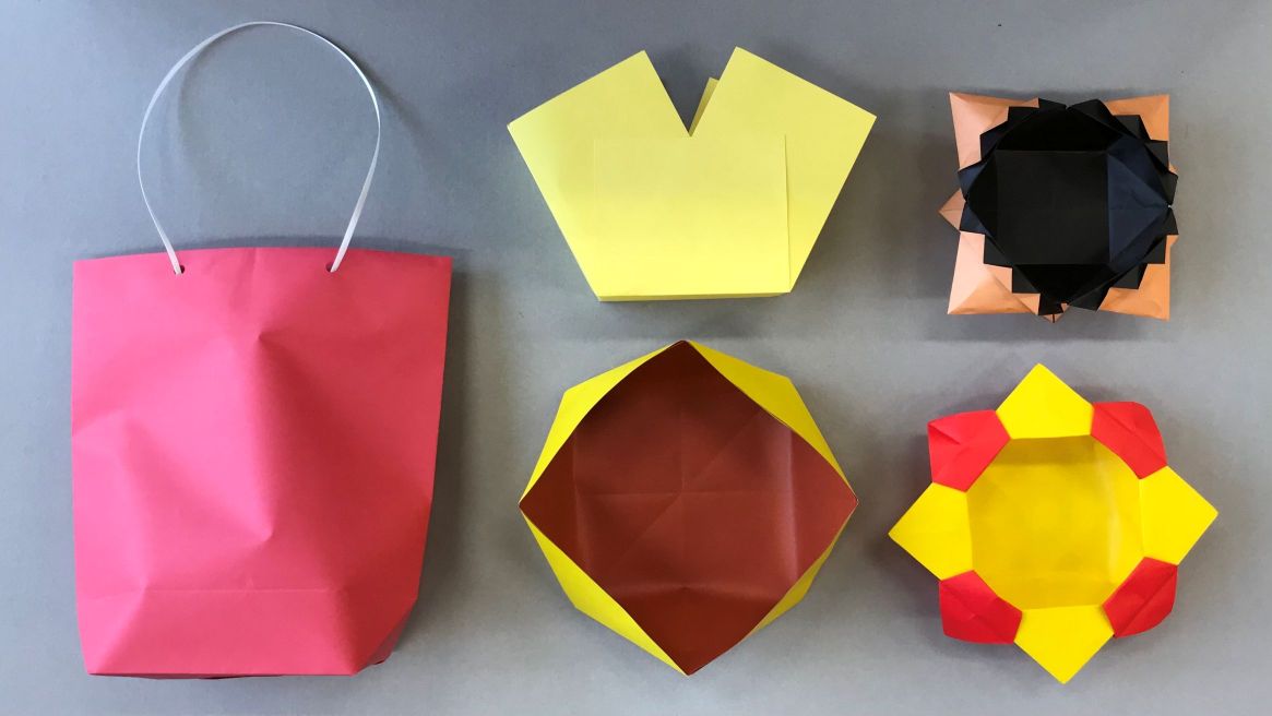 紙をつかって、ふくろや箱をつくってみよう。平面が立体になるおもしろさ。