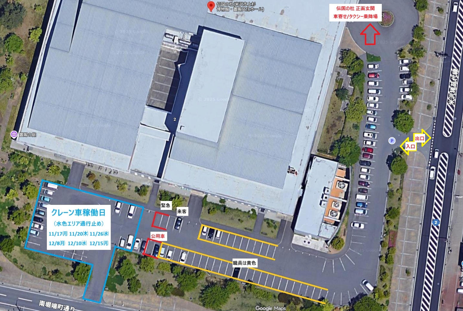 敷地内で大型クレーン車による作業が行われる日がありますが、東側の出入口(県道2号米沢猪苗代線/ファミリーマート側)から当館駐車場に出入りできます。